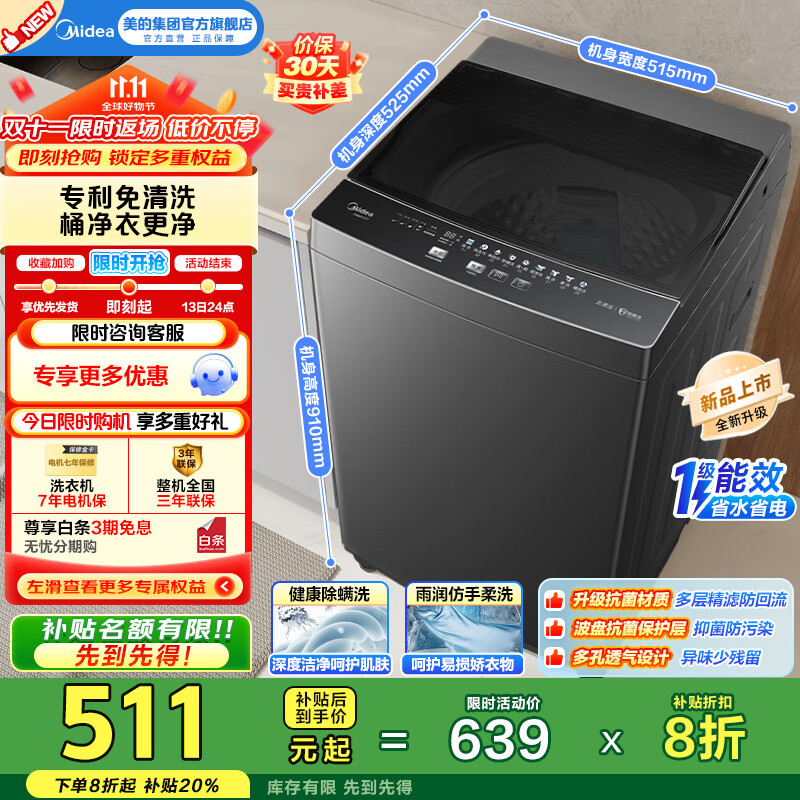 包邮 美的(Midea)全自动波轮洗衣机 8kg公斤家用电器品质电机智能预约立方内桶水电双宽一级能效 MB80V37T